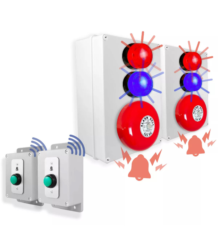 Wireless Warehouse & Industrial Doorbell Kit – 800m Range, 2 Bells with Red/Blue Strobes & 2 H/D Buttons (PROTECT 800)