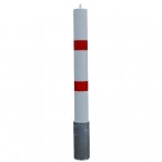 Heavy Duty Fold Down Red & White Security Post, supplied with a Top Mounted Eyelet (for use with rope & chains), Integral Locking Mechanism & 4 x Ground Bolts. Bolts directly to the ground